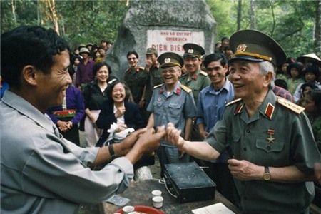 | Người dân Điện Biên chào mừng Đại tướng. Ở tuổi 83, ông vẫn rất nhanh nhẹn, minh mẫn. Phóng viên nước ngoài gọi Đại tướng bằng cái tên đầy thán phục: "Núi lửa phủ tuyết". Ảnh: Catherine Karnow. |