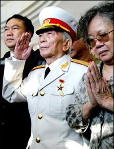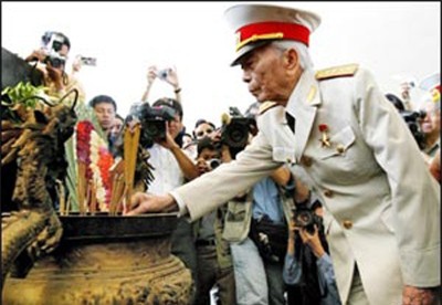 | Năm 2004, cũng vào dịp kỷ niệm chiến thắng Điện Biên Phủ, người anh cả của quân đội nhân dân Việt Nam trở về chiến trường xưa. Đại tướng thắp nén hương tưởng niệm những người đã khuất. Ảnh: AP. |