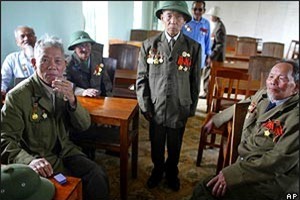 | Các cựu chiến binh của chiến trường Điện Biên Phủ chờ tướng Giáp khi ông tới thăm Điện Biên Phủ năm 2004. Ảnh: AP. |
