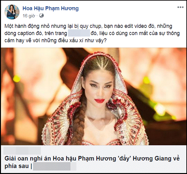 Cụ thể, trang fanpage chia sẻ một bài báo giải oan cho Phạm Hương về tin đồn "đẩy Hương Giang, không cho đứng ngang hàng" trong show diễn thời trang của NTK Đỗ Long diễn ra vào tối 24/6.