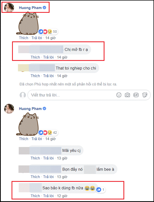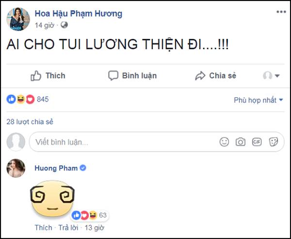 Trong một status khác với nội dung "Ai cho tui lương thiện", hoa hậu cũng dùng tài khoản "Huong Pham" để bình luận.