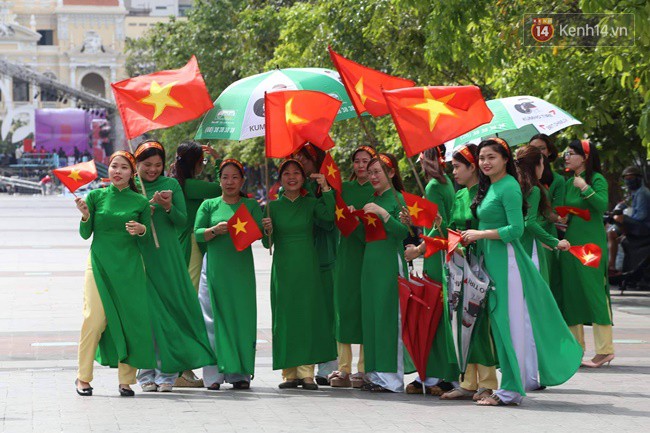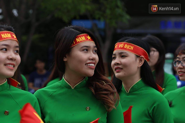 Các cô gái trong trang phục áo dài truyền thống cũng rất hào hứng chờ đợi đến giờ trận đấu diễn ra. Ảnh: Tứ Qúy