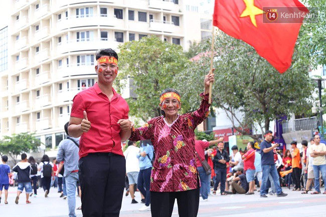Nam thanh niên dẫn theo bà ra phố đi bộ Nguyễn Huệ để tiếp lửa cho thầy trò HLV Park Hang Seo