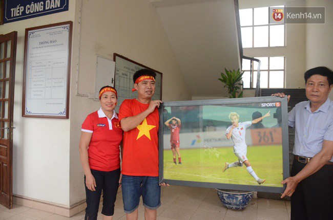 Tại Hải Dương, một người hâm mộ đã chiếc cup vàng lên người vui vẻ chụp hình cùng bố mẹ cầu thủ Văn Toàn. Ảnh: Ngọc Thắng