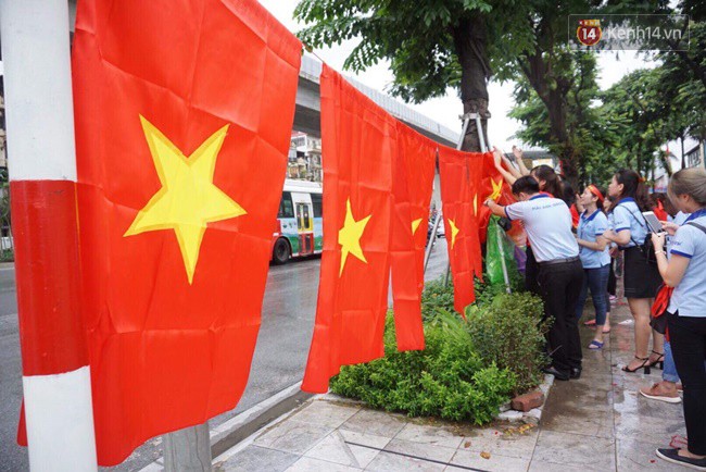 Ai cũng áo đỏ, Quốc kỳ, băng rôn sẵn sàng - Ảnh: Phương Thảo