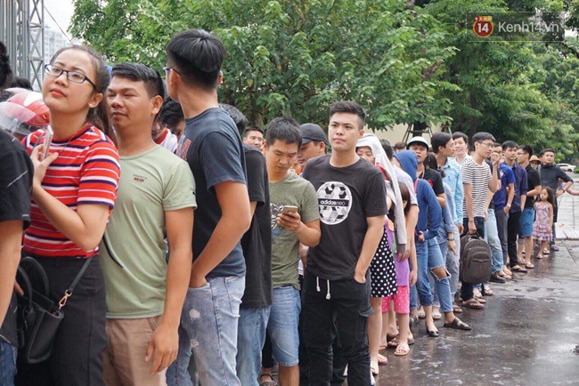 Hàng dài người hâm mộ đang xếp hàng để nhận áo và băng rôn miễn phí trước giờ diễn ra trận đấu Bán kết