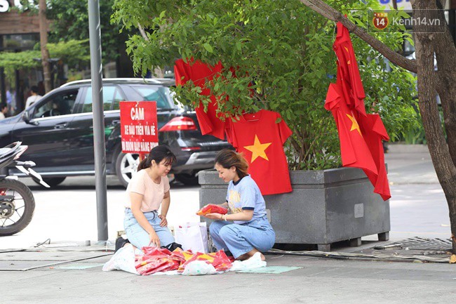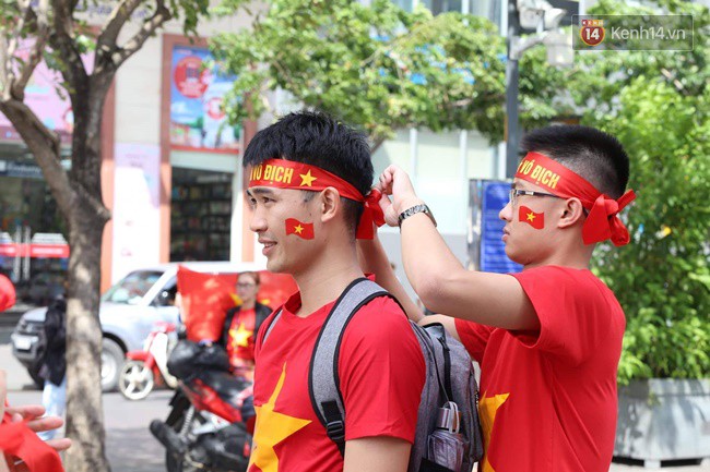 Không chỉ tại những nơi có màn hình rộng phục vụ theo dõi trận đấu, ngoài đường phố, người dân cũng đang bất bật trang trí nhiều băng rôn, khẩu hiệu. Việc buôn bán cờ, áo đỏ sao vàng, kèn trống cổ động cũng đắt khách hơn khi sát giờ bóng lăn.