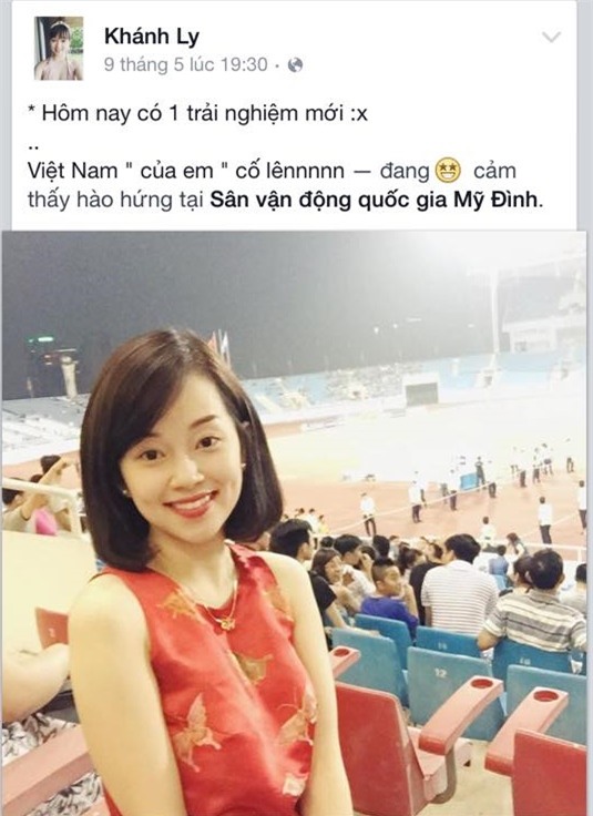 tham dự. Hotgirl Hà Thành viết caption đầy ẩn ý: "Hôm nay có một trải nghiệm mới. Việt Nam "của em" cố lên". Chữ "của em" được Khánh Ly để trong ngoặc kép khiến bạn bè của cô đều để ý.