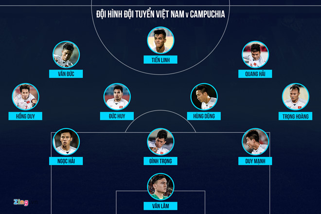 Trước Campuchia đã chắc chắn bị loại và áp lực không quá lớn trong cuộc cạnh tranh vé vào chơi bán kết, HLV Park Hang Seo quyết định để Công Phượng cùng Xuân Trường ngồi ngoài. Thay thế là Tiến Linh và Đức Huy.