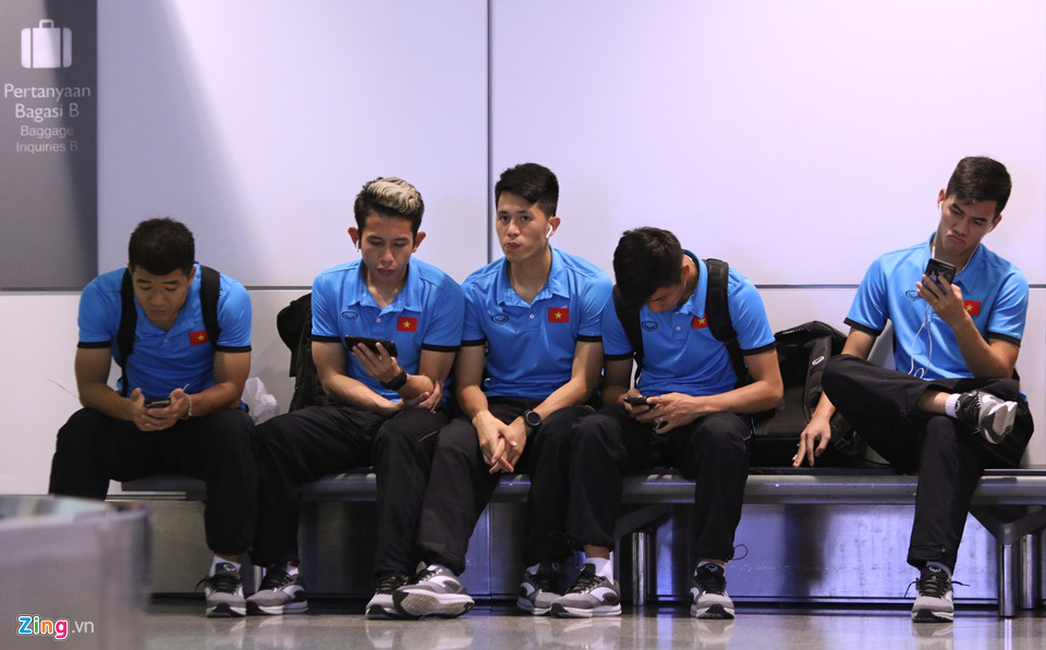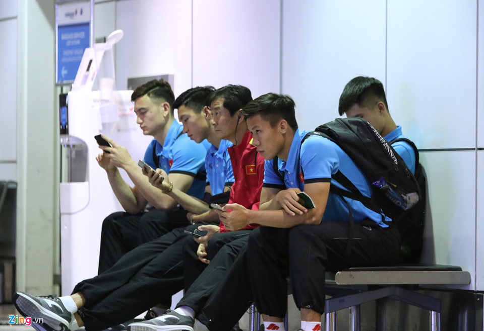 Sau khi nhập cảnh, các cầu thủ tranh thủ nghỉ ngơi, xem điện thoại và gọi điện về cho người thân sau khi kết nối với wifi sân bay.