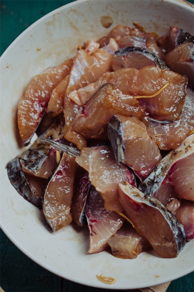 Cắt miếng cá dày chừng 2cm, sau đó cho phần gia vị ướp cá vào trộn đều. Ướp 10 phút.