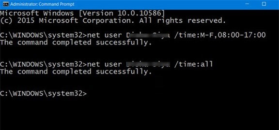Hộp thoại Command Prompt sẽ xuất hiện và bạn cần phải gõ dòng lệnh sau vào đó: net user username /times:M-F,10:00-22:00;Sa-Su,09:00-23:00. Tại đây, bạn cần phải thay "username" bằng tên tài khoản đăng nhập vào máy tính mà bạn muốn thiết lập giới hạn và điều chỉnh thời gian theo mong muốn.
