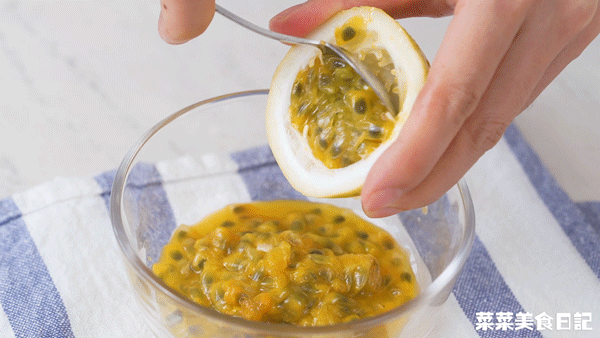 - Bước 3: Bổ đôi chanh leo, rồi dùng thìa múc lấy phần thịt quả cho vào bát.