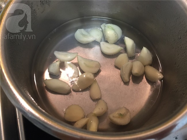 Đun 1 nồi nước có cho muối vào, khi sôi thả tỏi vào, ngâm trong nước sôi 5 phút, vớt ra để thật ráo.