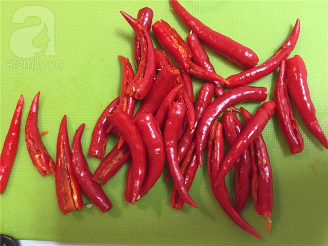 Ớt rửa sạch, dùng mũi kéo rạch 1 đường dọc theo trái ớt, sau đó tách bỏ hết hạt ớt. Nếu ớt bị ướt thì để vào rổ cho ráo nước.
