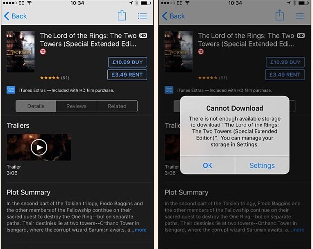 Khi người dùng click vào nút Rent ngay cạnh bộ phim, một cảnh báo sẽ xuất hiện, cho biết không còn đủ không gian lưu trữ để thực hiện lựa chọn. Người dùng khi đó chỉ có thể lựa chọn OK hoặc Settings.