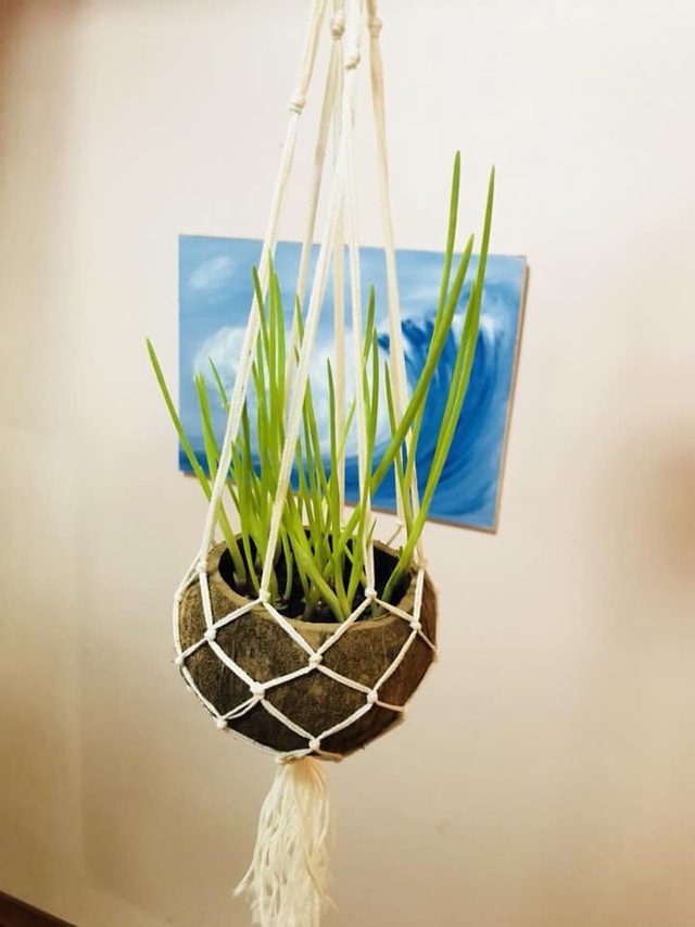 Chiếc sọ dừa cũ kĩ được sử dụng làm chậu cây trồng hành lá. Chiếc rọ được chị Hương khéo léo đan từ sợi.