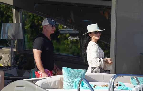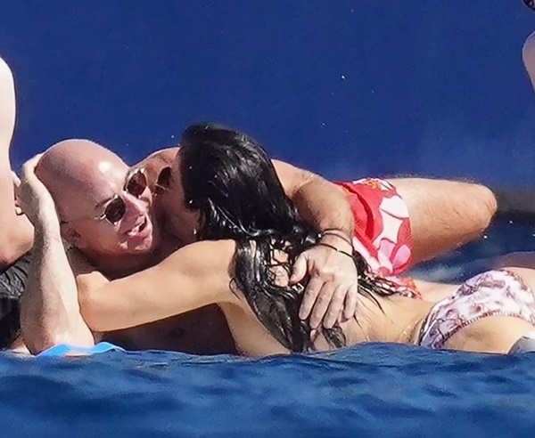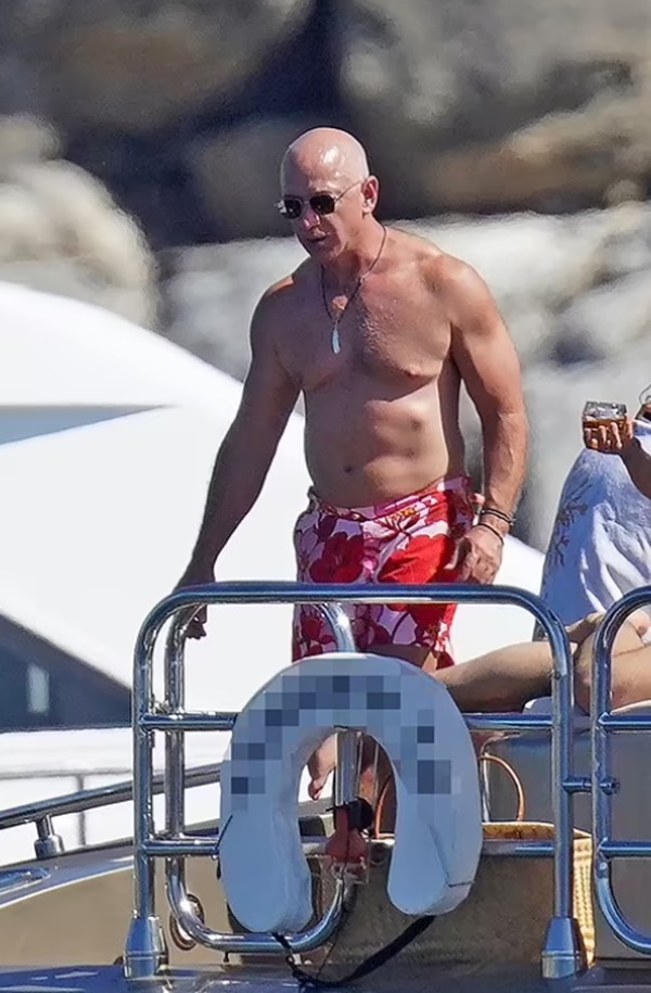 Ông để ngực trần và mặc quần đùi màu hồng đỏ nổi bật. Trong khi đó, bạn gái của ông, bà Lauren Sanchez mặc bikini có họa tiết trắng đỏ khoe vóc dáng nuột nà ở tuổi 51. Cặp đôi không ngần ngại ôm hôn nhau thắm thiết trên du thuyền dưới ánh nắng mặt trời chói chang.