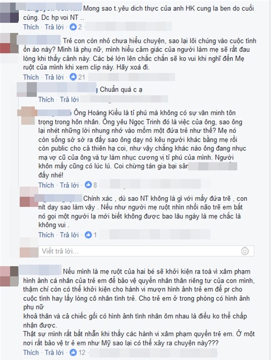 Hay: Trẻ con còn nhỏ chưa hiểu chuyện, sao lại lôi chúng vào cuộc tình ồn ào này? Mình là phụ nữ, mình hiểu cảm giác của người làm mẹ sẽ rất đau lòng khi thấy cảnh này. Các bé lớn lên chắc chắn sẽ không vui khi nghĩ đến Mẹ ruột của mình khi xem clip này. Hãy xoá đi.