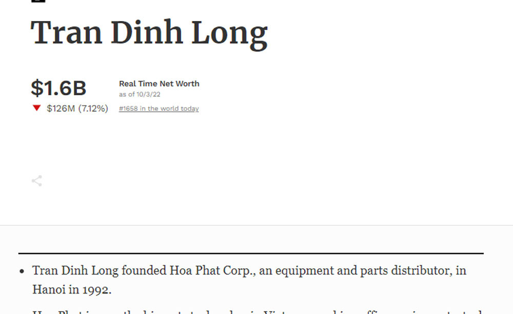 Theo Forbes, tính tới 3/10/2022 tài sản của ông Trần Đình Long còn 1,6 tỷ USD.