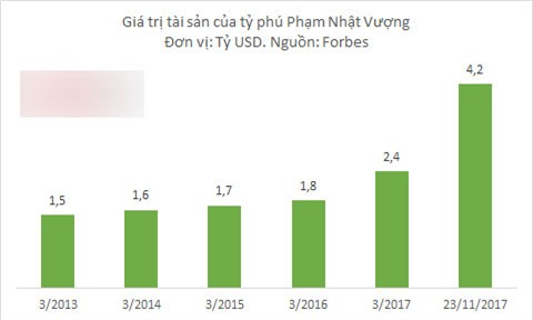 Tài sản của tỷ phú Phạm Nhật Vượng đang tăng chóng mặt trong năm 2017, từ mức 2,4 tỷ USD hồi tháng 3, chỉ sau 8 tháng tài sản của ông Vượng đã tăng thêm 1,8 tỷ USD.