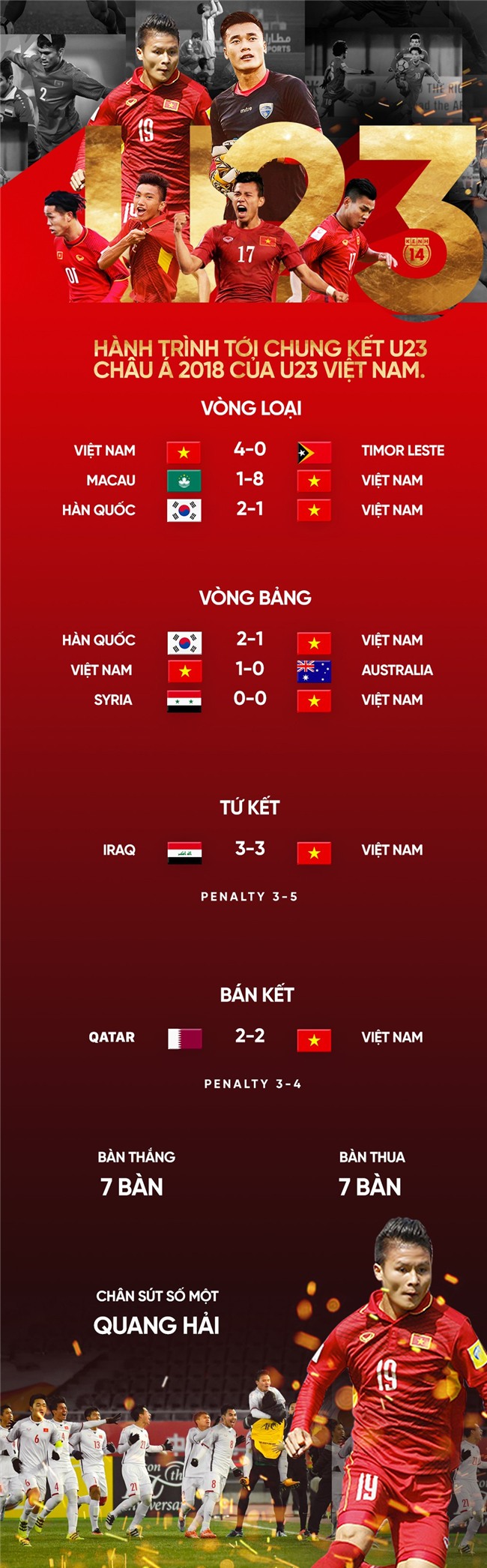 Từ đầu giải, U23 Việt Nam chơi 5 trận, ghi 7 bàn và để lọt lưới 7 bàn. Chân sút nổi bật nhất đội là Quang Hải với 4 bàn thắng.