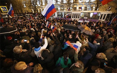 Hàng nghìn người dân tập trung bên ngoài tòa nhà nghị viện Crimea trước khi phiên họp diễn ra. Khi biết quyết định của các nghị sĩ, họ reo hò và hô: "Nước Nga!".