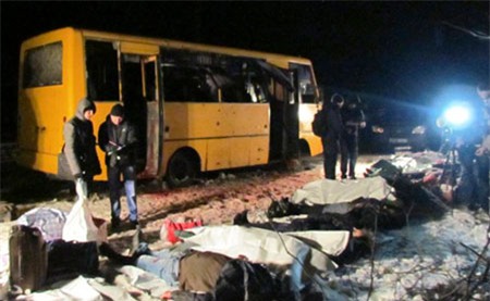 Hàng tin Pháp dẫn nguồn tin cho biết xe buýt bị bắn bằng tên lửa tầm xa Grad. Ảnh chụp từ hiện trường cho thấy các thi thể được người dân đặt bên vệ đường. Trên thân xe buýt lỗ chỗ nhiều vết thủng.