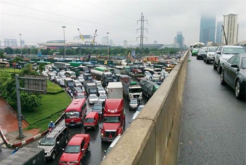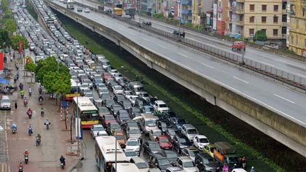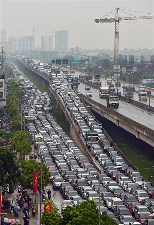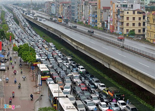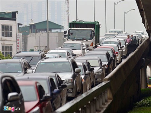 Đường phía dưới tắc khiến đường trên cao cũng tắc theo vì phương tiện không thể xuống cầu cạn. Ôtô đỗ thành 6-7 hàng dàn kín mặt đường. Ảnh: Hoàng Anh. |