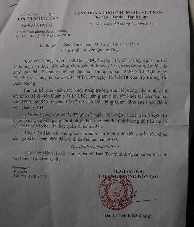 Tuy nhiên, ngày 9/10, Học viện Hậu cần có thông báo gửi Ban tuyển sinh Quân sự tỉnh Hà Tĩnh và thí sinh Nguyễn Quang Huy về việc thí sinh không đủ tiêu chuẩn sức khỏe đào tạo ĐHQS năm 2018.