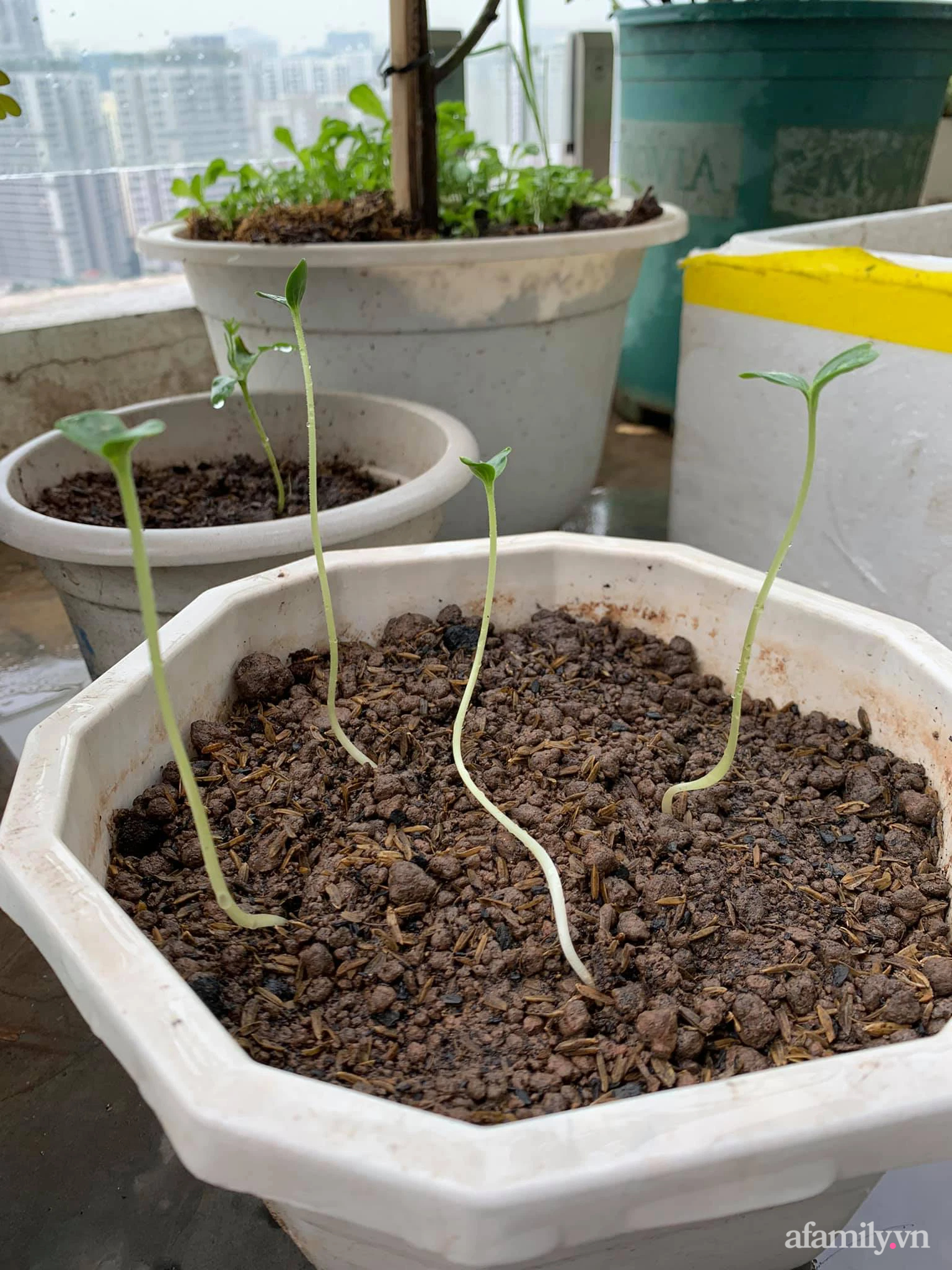 Ban đầu Mai Ly chuẩn bị thùng xốp xin ở siêu thị của khu chung cư, sau đó là đất và hạt giống rau. Riêng dưa hấu, cà chua thì cô mua quả về ăn sau đó giữ lại hạt.