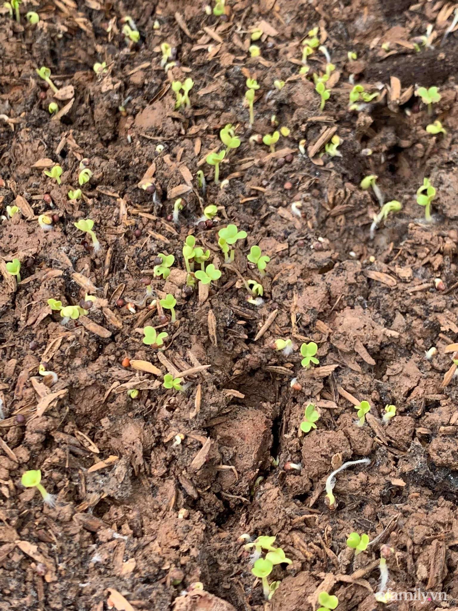Sau khi cô pha bình nước rửa bát để tưới diệt rệp thì chỉ được vài nhánh rau còn sống. Các em cải gieo bên gốc hoa hồng may mắn vẫn sống sót.