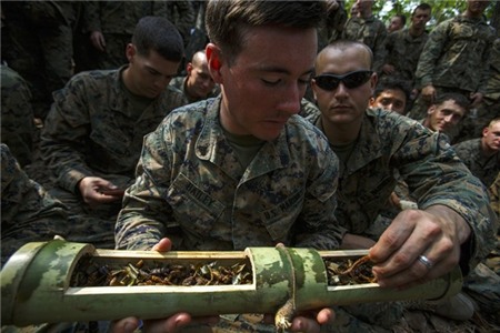 Binh sĩ tham gia tập trận cũng phải ăn những con bọ cạp sống. Đây là yêu cầu bắt buộc của các bài tập sống sót trong rừng. Các lực lượng tác chiến đặc biệt của Mỹ và các quốc gia khác đều phải nắm vững những kỹ năng này. |