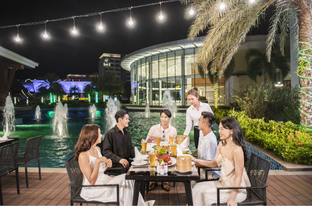 Vinpearl đón du khách với không gian thiên nhiên tuyệt mỹ của resosrt biển 5 sao đẳng cấp quốc tế với phòng nghỉ riêng tư hay villa hướng biển kiến trúc tân cổ điển sang trọng. Thiên đường ẩm thực hội tụ đặc sản các vùng miền hay tinh hoa món ngon Á - Âu tại Vinpearl sẽ chiêu đãi du khách những đại tiệc buffet khó quên trong mỗi kỳ nghỉ. Di chuyển sang Grand World, du khách còn bắt gặp nhiều “menu tự chọn” đặc sắc của thành phố đảo như hải sản Hàm Ninh, bún quậy Kiến Xây, bò tơ Phú Quốc hay trải nghiệm food-tour 5 châu dọc theo các tuyến phố náo nhiệt.