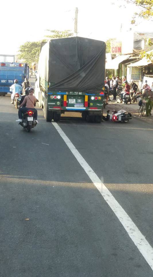 Vụ va chạm khiến cho người phụ nữ cùng xe té xuống đường. Riêng nạn nhân bị bánh xe container cán qua người tử vong tại chỗ. Hiện trường, thi thể nạn nhân dưới bánh xe, giao thông qua khu vực ùn ứ.