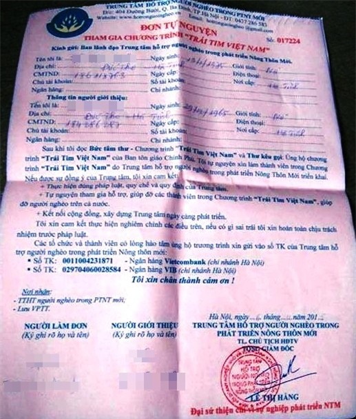 Đơn tự nguyện tham gia chương trình "Trái tim cho em" mà bà Tý sử dụng để mời người dân góp tiền nhận lãi khủng. |