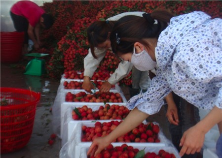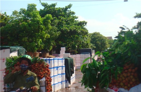 Dọc quốc lộ 31 đường vào thị trấn Chũ, những điểm mua bán đang mở hết công xuất đóng hàng, những lô vải vỏ chưa chín đỏ, được đóng thùng để vận chuyển đi tiêu thụ.