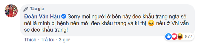 Bên dưới phần bình luận, cầu thủ sinh năm 1999 này đã đưa ra lời giải thích, đồng thời tiết lộ về sự thật "đắng lòng" tại Hà Lan: "Xin lỗi mọi người. Ở bên này đeo khẩu trang người ta sẽ nói là mình bị bệnh nên mới đeo khẩu trang và kỳ thị. Nếu ở Việt Nam vẫn sẽ đeo khẩu trang!"