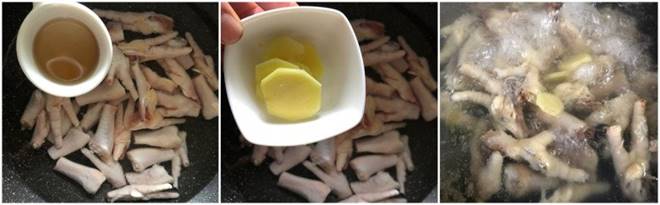 Cho chân gà vào nồi với nước, thêm rượu nấu ăn cùng gừng vào. Luộc sôi trong khoảng 7-10 phút. Luộc đến khi chân gà hơi nứt da thì tắt ngay bếp. Luộc lâu chân gà chín mềm nhũn mất ngon.