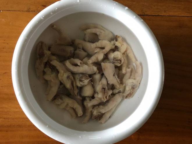 Chân gà chặt bỏ móng, rửa sạch sau đó chặt thành 3 miếng.