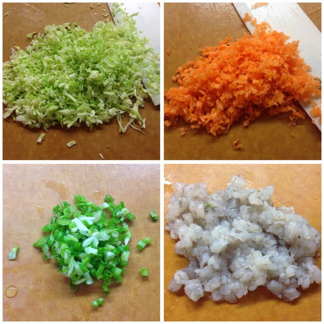 Bạn nạo vỏ cà rốt, rửa sạch và bào nhỏ. Rau bắp cải cũng thái thành dạng sợi nhỏ sau khi rửa sạch. Hành lá bỏ gốc, rửa sạch, thái nhỏ. Tôm nõn mang rửa với rượu trắng (nếu có) cho thơm, rồi tráng lại với nước, thấm khô và cũng băm nhỏ.