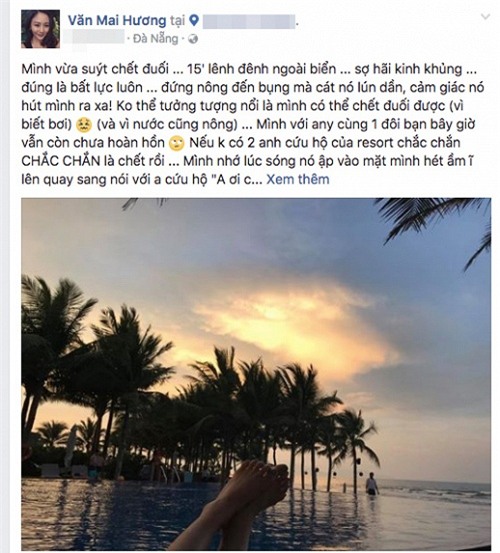 Mới đây, trên Facebook cá nhân, Văn Mai Hương đã chia sẻ lại câu chuyện suýt chết đuối ngoài biển ở Đà Nẵng khiến rất nhiều người lo lắng, hoảng hốt. Theo đó, chiều 30/4, nữ ca sĩ và bạn trai cùng hai người bạn thân ra bãi biển bơi.
