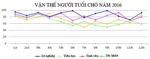Bước vào năm 2016, người tuổi Chó bắt đầu gặp nhiều may mắn về cả công việc lẫn tiền bạc. Vận may rất tốt nhưng năm nay họ có thể xảy ra một số mâu thuẫn với nửa kia của mình. Ngoài ra, người tuổi Chó nên chú ý sức khỏe của bản thân và gia đình trong năm nay. Khám sức khỏe toàn diện định kì là một lựa chọn tốt. Nếu có bất kỳ vấn đề sức khỏe, xin vui lòng đi khám bác sĩ càng sớm càng tốt. Tránh tham gia vào các hoạt động ngoài trời để hạn chế tai nạn có thể xảy đến.