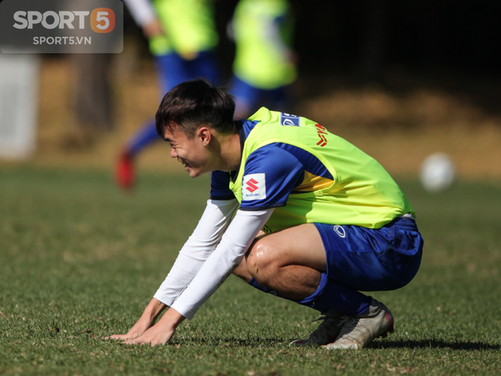 Tiền đạo sinh năm 1996 không làm chủ được tốc độ kèm việc bị vấp cỏ. Anh ngã dúi dụi xuống đất và lăn vài vòng. HLV Park Hang Seo lúc đó đứng quay lưng cũng giật mình vì tiếng động. Sau đó, ông tiến tới hỏi han cậu học trò, còn Văn Toàn thì chỉ biết cười trừ cho đỡ xấu hổ. Ảnh: Nhân Văn.