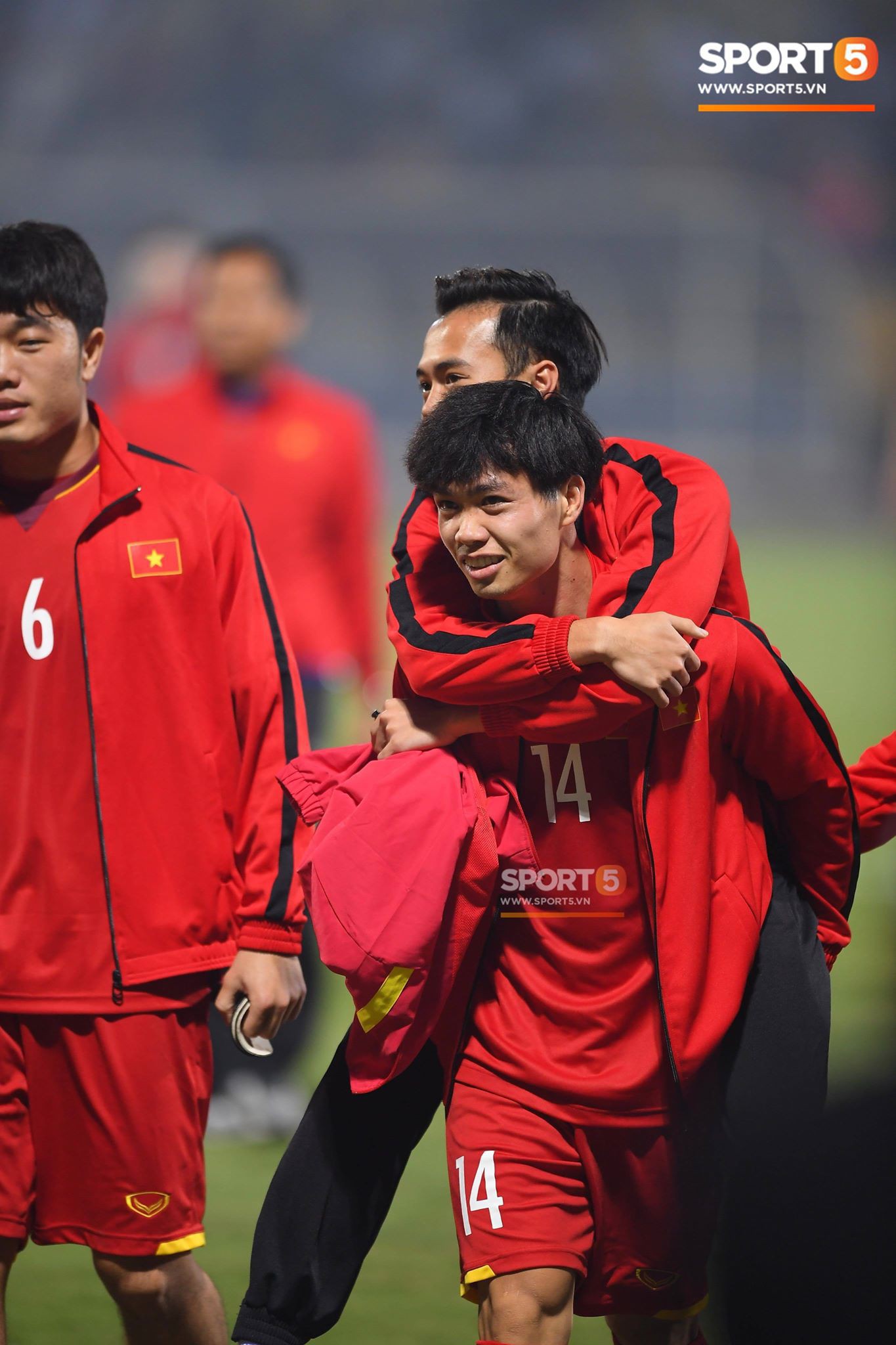 Công Phượng luôn là người cõng Văn Toàn khi Toàn gặp chấn thương. Ảnh: Tiến Tuấn.