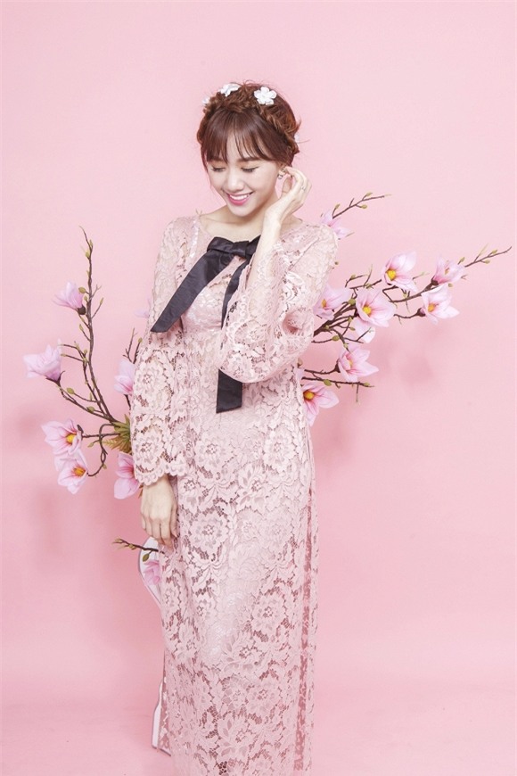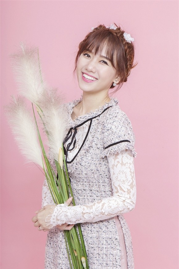Không xuất hiện với áo dài truyền thống, Tết Đinh Dậu 2017 này Hari Won chọn áo dài ren cách tân với các tông màu pastel nhẹ nhàng, thanh thoát. Chất liệu ren là một trong những chất liệu ít ai nghĩ đến khi lên ý tưởng thiết kế áo dài, vì vậy, đây cũng chính là nét độc đáo của bộ ảnh mừng năm mới lần này.
