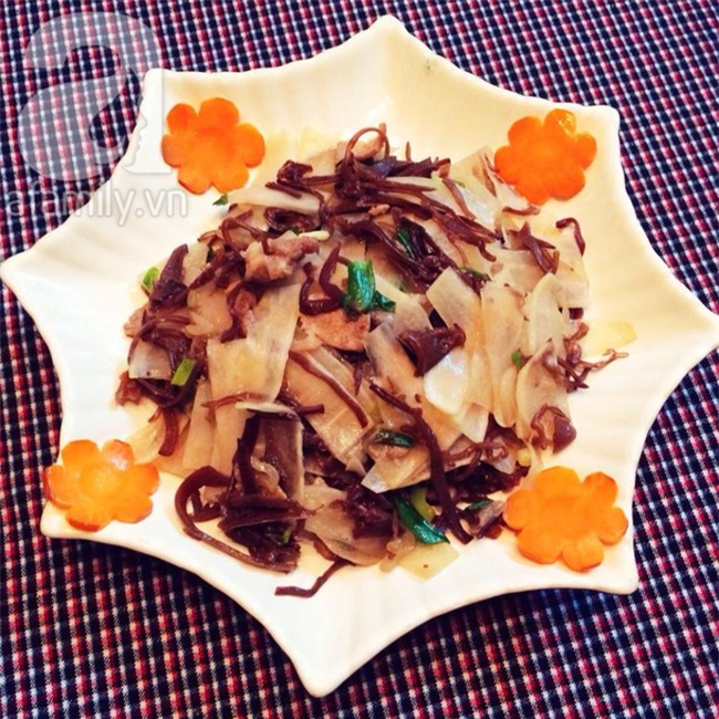 Củ cải thái mỏng, mộc nhỉ ngâm nở thái chỉ.