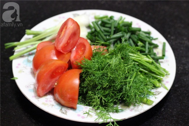Cà chua thái múi cau, thì là, hành lá cắt khúc dài khoảng 2cm, hành củ để riêng.