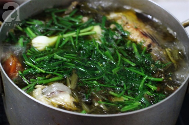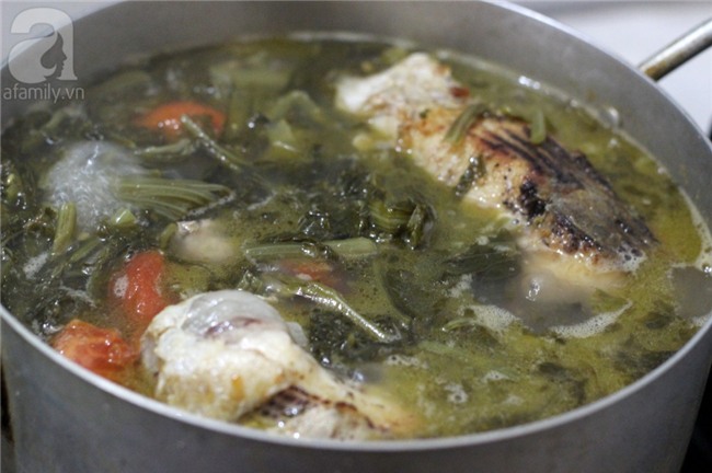 Nhẹ nhàng cho cá vào nồi, đậy vung đun cho canh cá sôi lên thì vặn nhỏ lửa, đun liu riu chừng 15 phút.