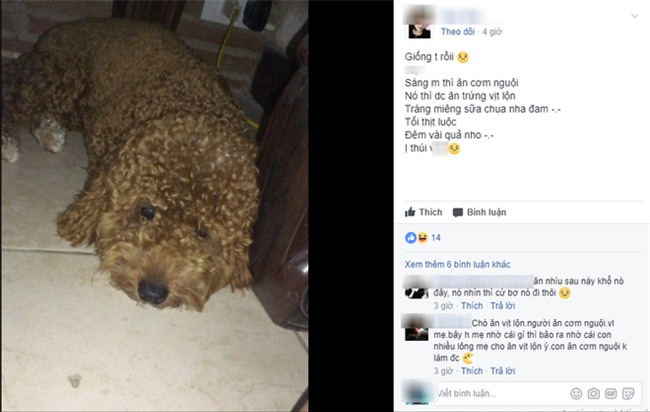 Sẵn tiện dịp khóc than san sẻ cho nhau nghe, một người dùng mạng khác có tên Minh Ngọc nói về số phận con ruột mà như con lượm về từ bãi rác như sau: "Mẹ tôi cũng cưng chó hơn con. Mấy hôm tôi lỡ tay nấu cơm khê thì mẹ bắt tôi phải ăn phần cháy bên dưới, còn cơm trắng dẻo là dành cho chó vì nó không ăn cơm khô, cháy cứng được".